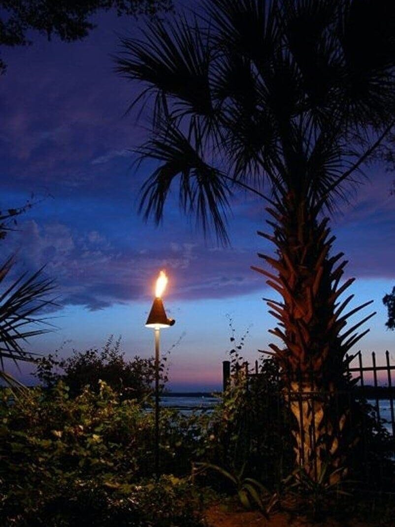 Beautiful outdoor scene featuring palm trees and torch lighting during twilight for a cozy garden atmosphere on a waterfront property in Bluffton.
